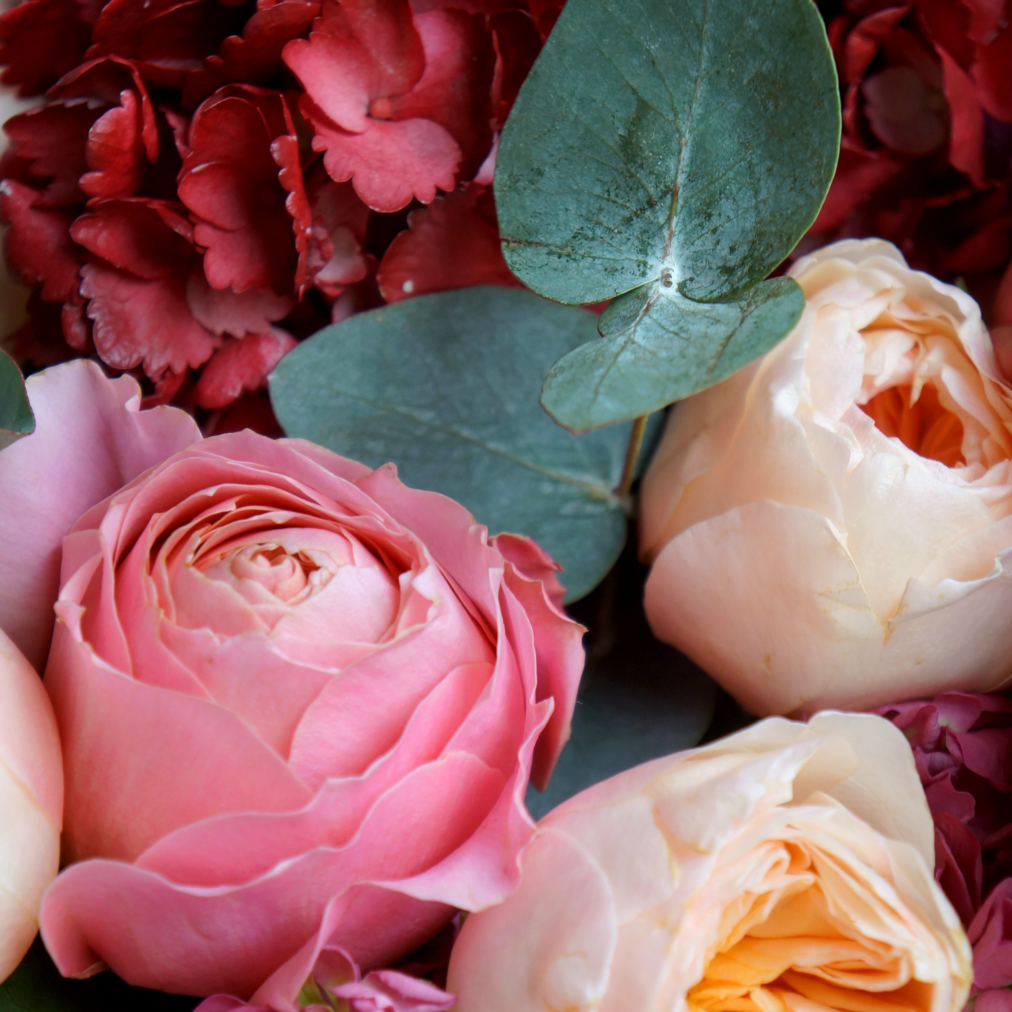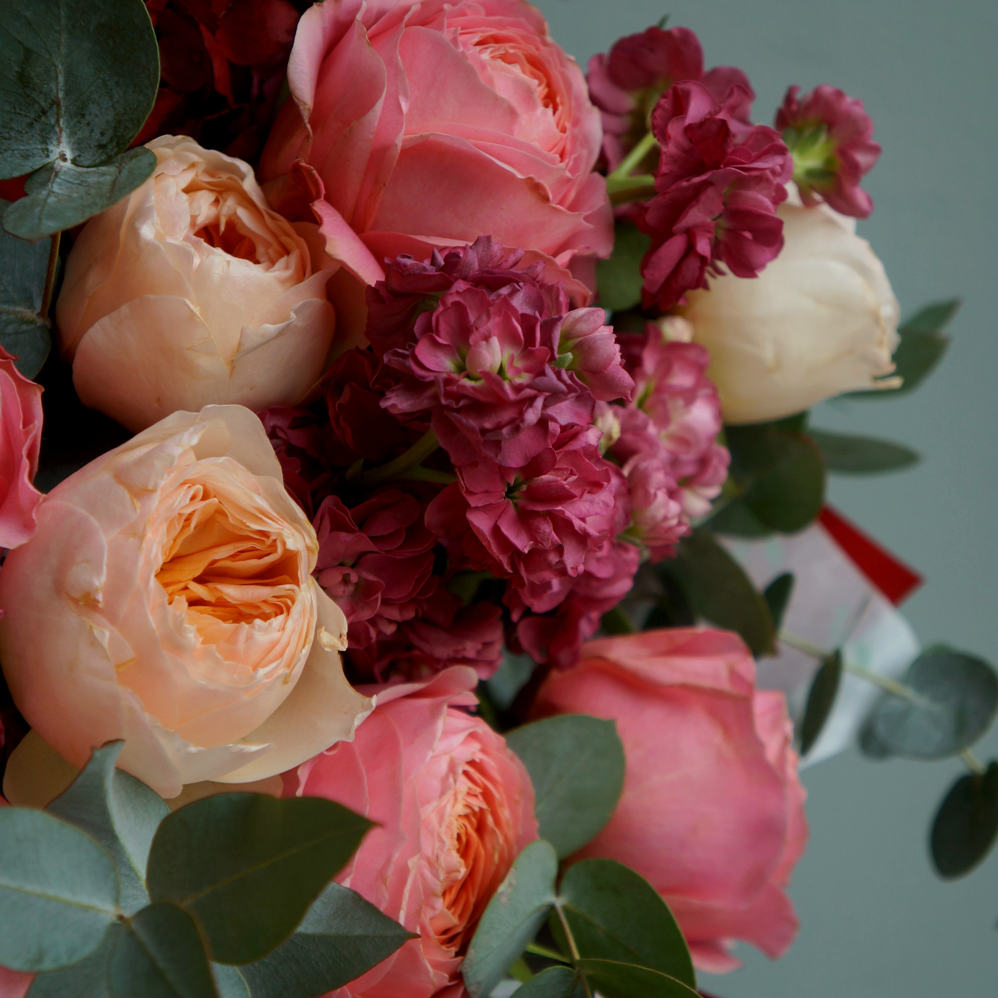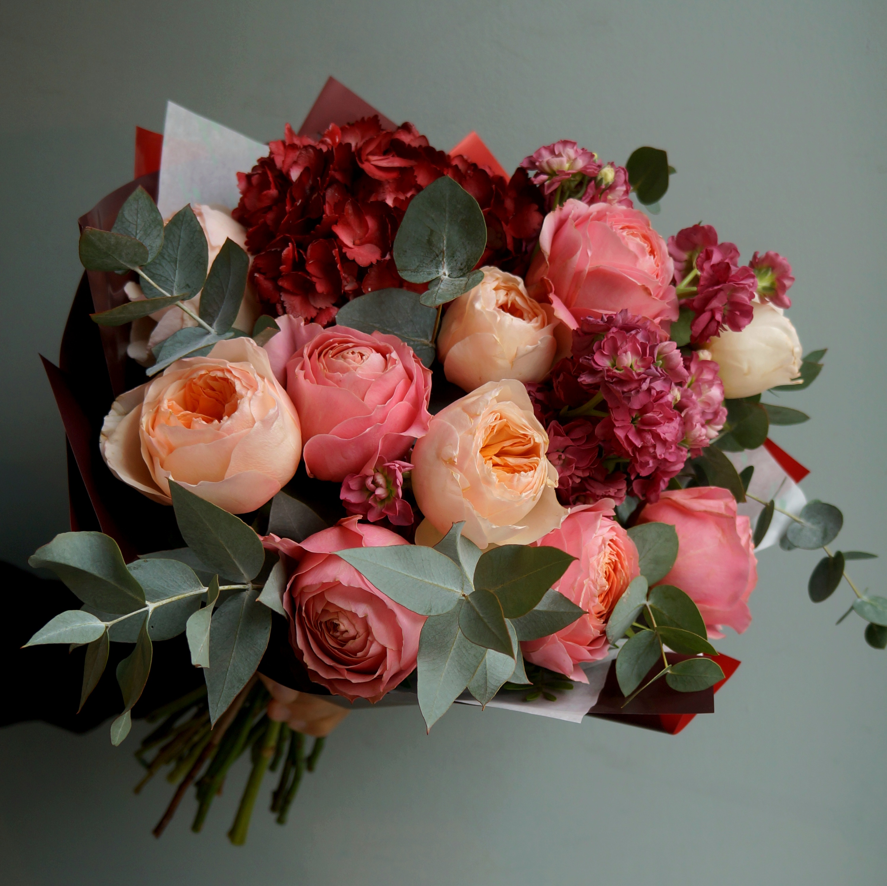 На фото букет из 11 роз с маттиолой, гортензией и эвкалиптом 🌿