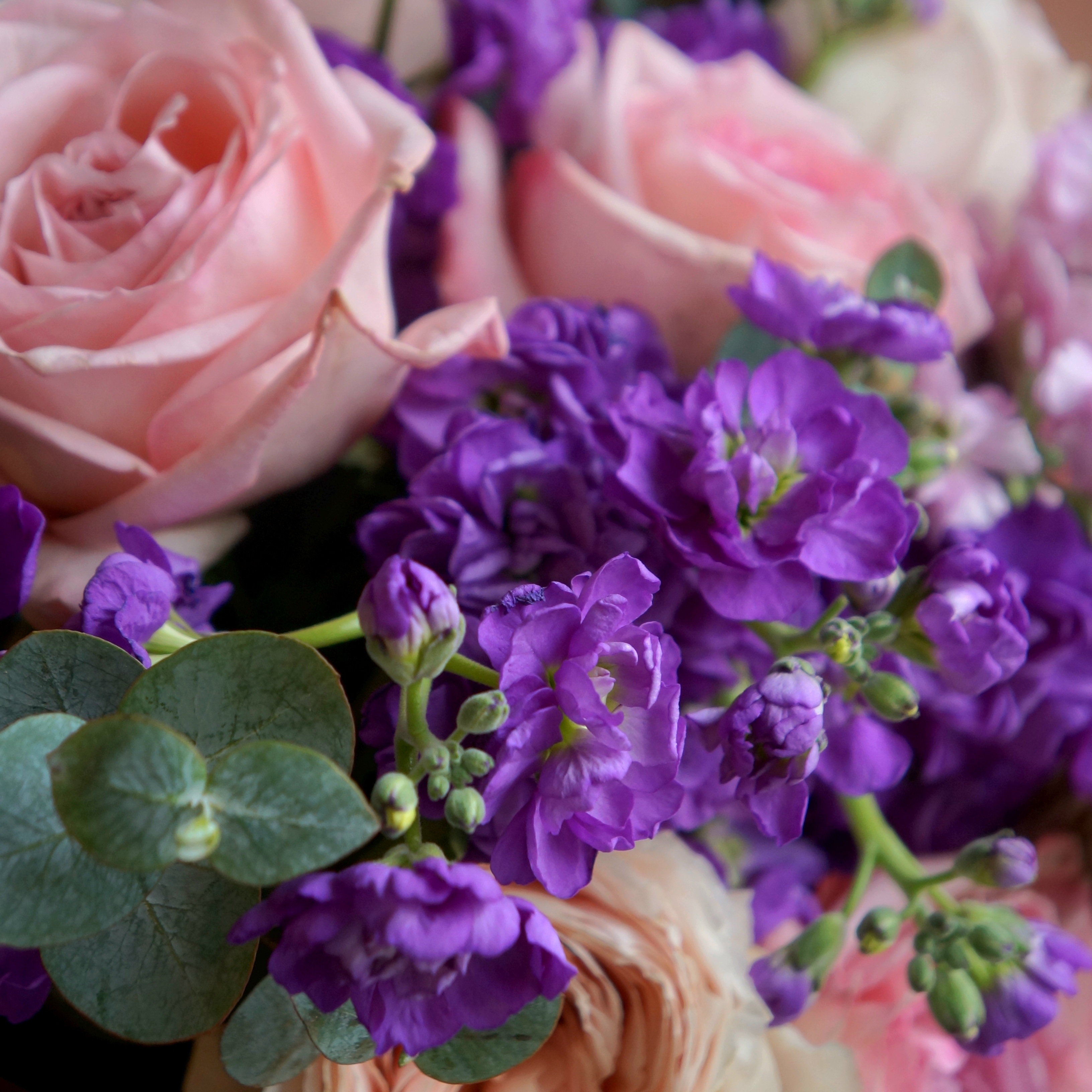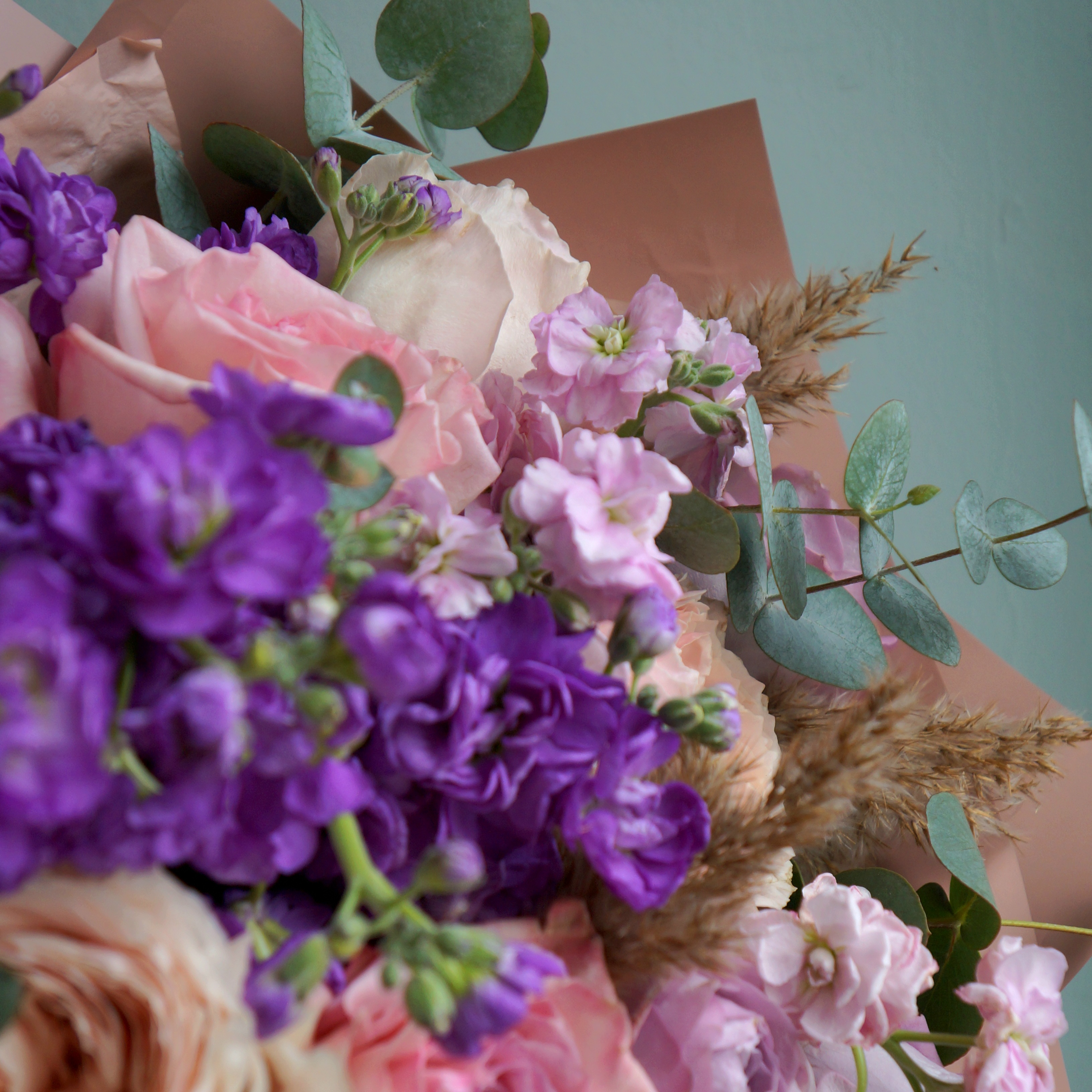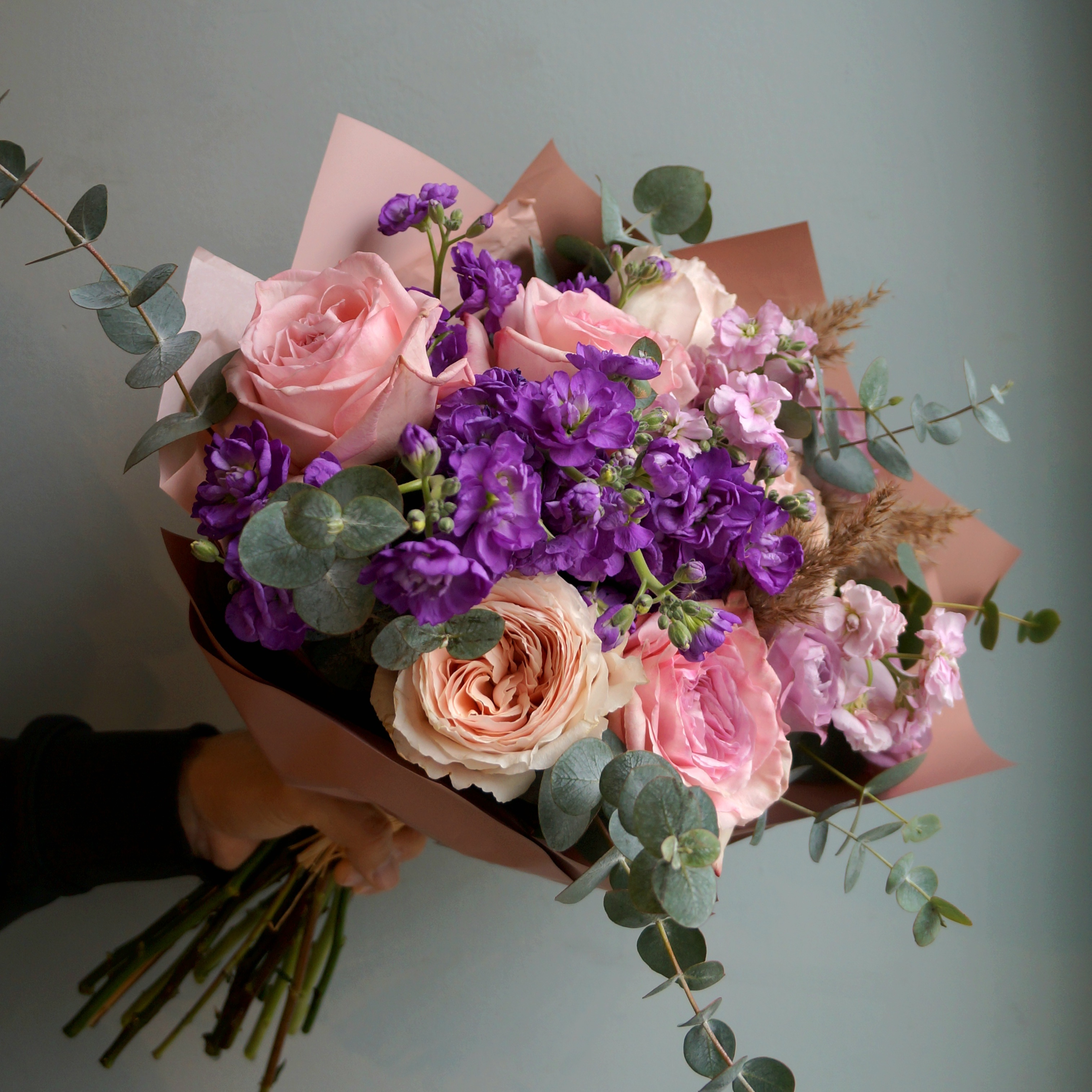 На фото укет из 13 роз с маттиолой и эвкалиптом 🌿