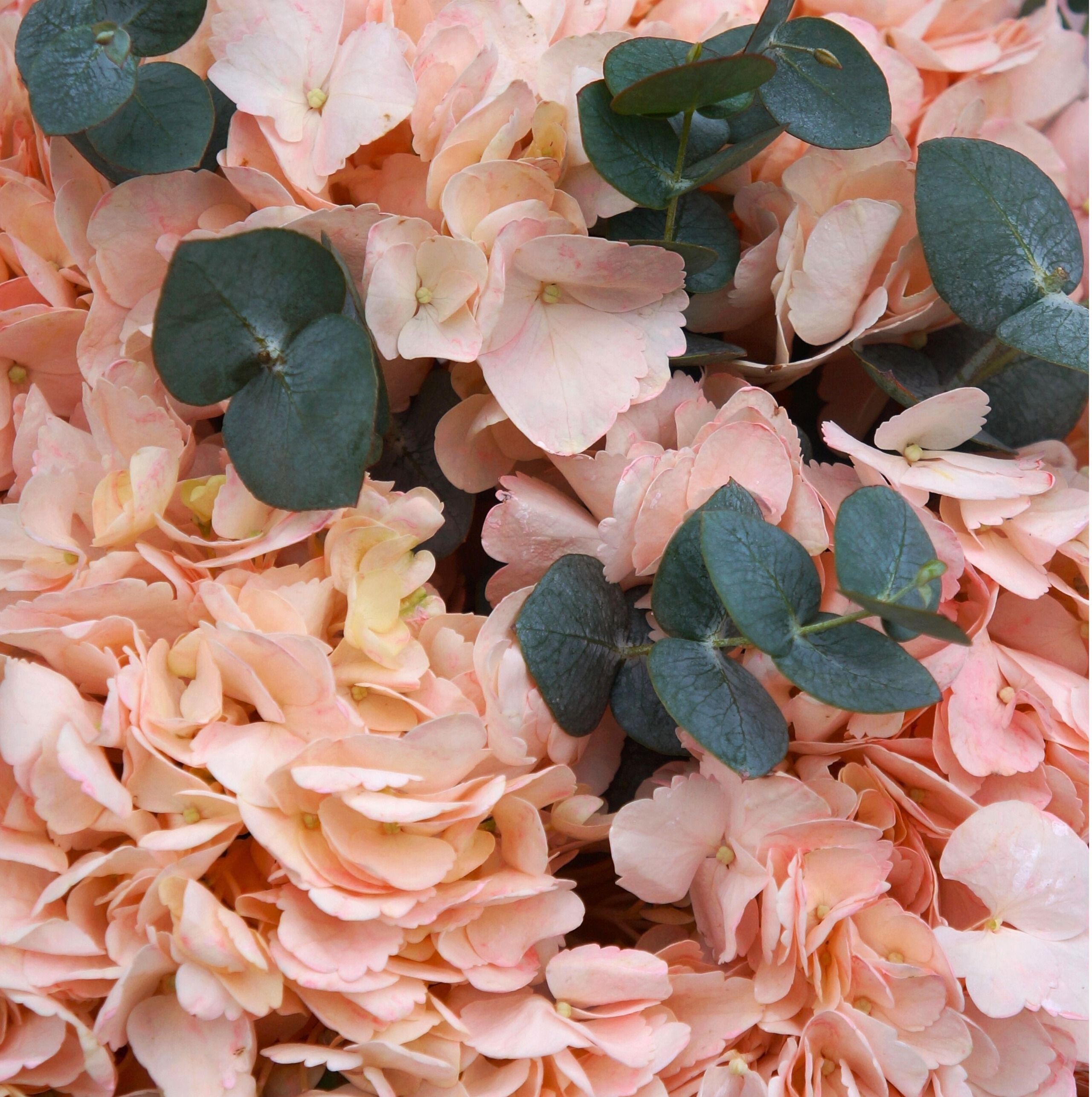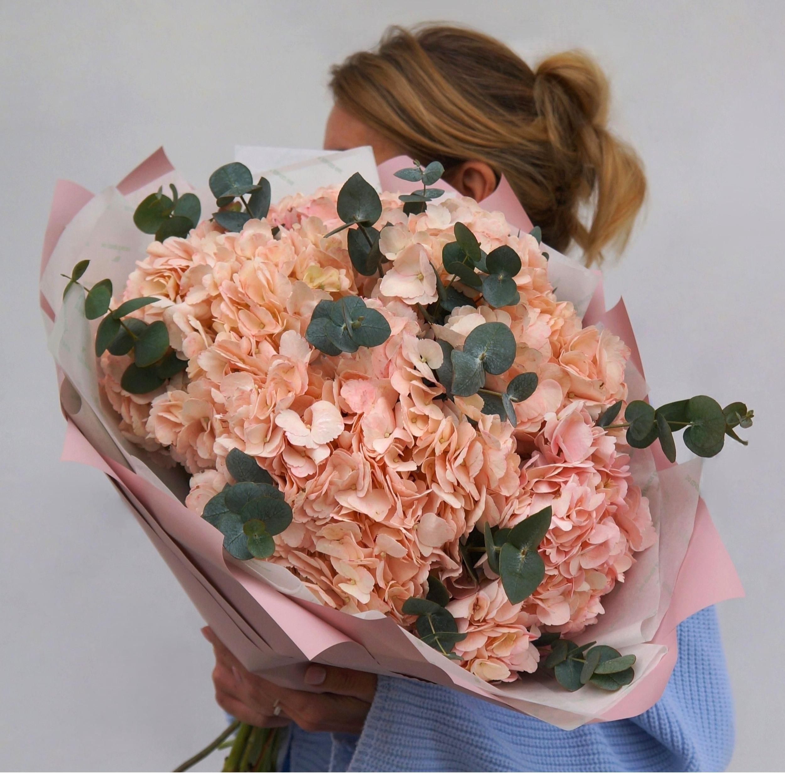 Гортензия, сезонная зелень, деревянное кашпо, фирменная упаковка, фирменная карточка для текста (по желанию).