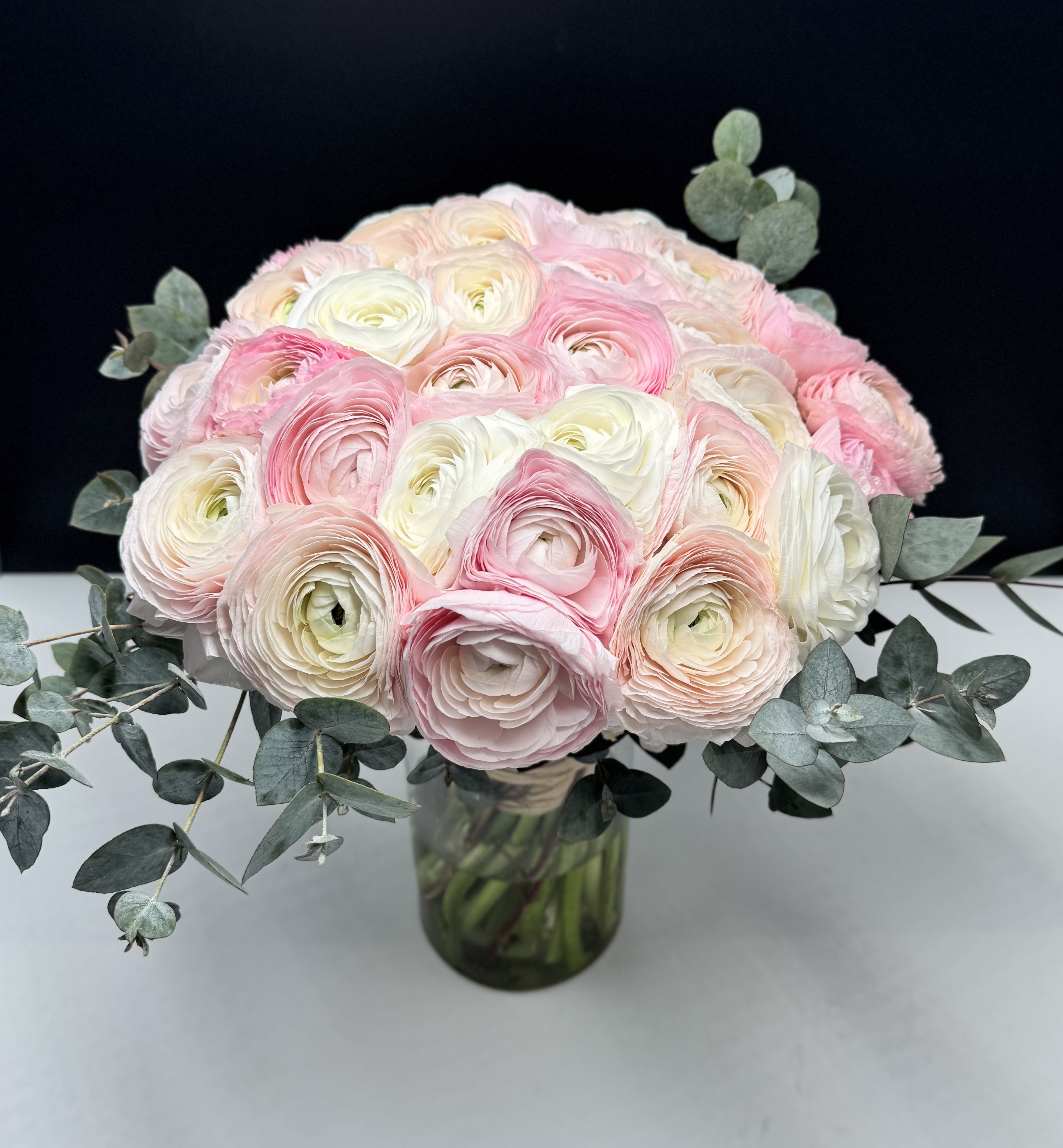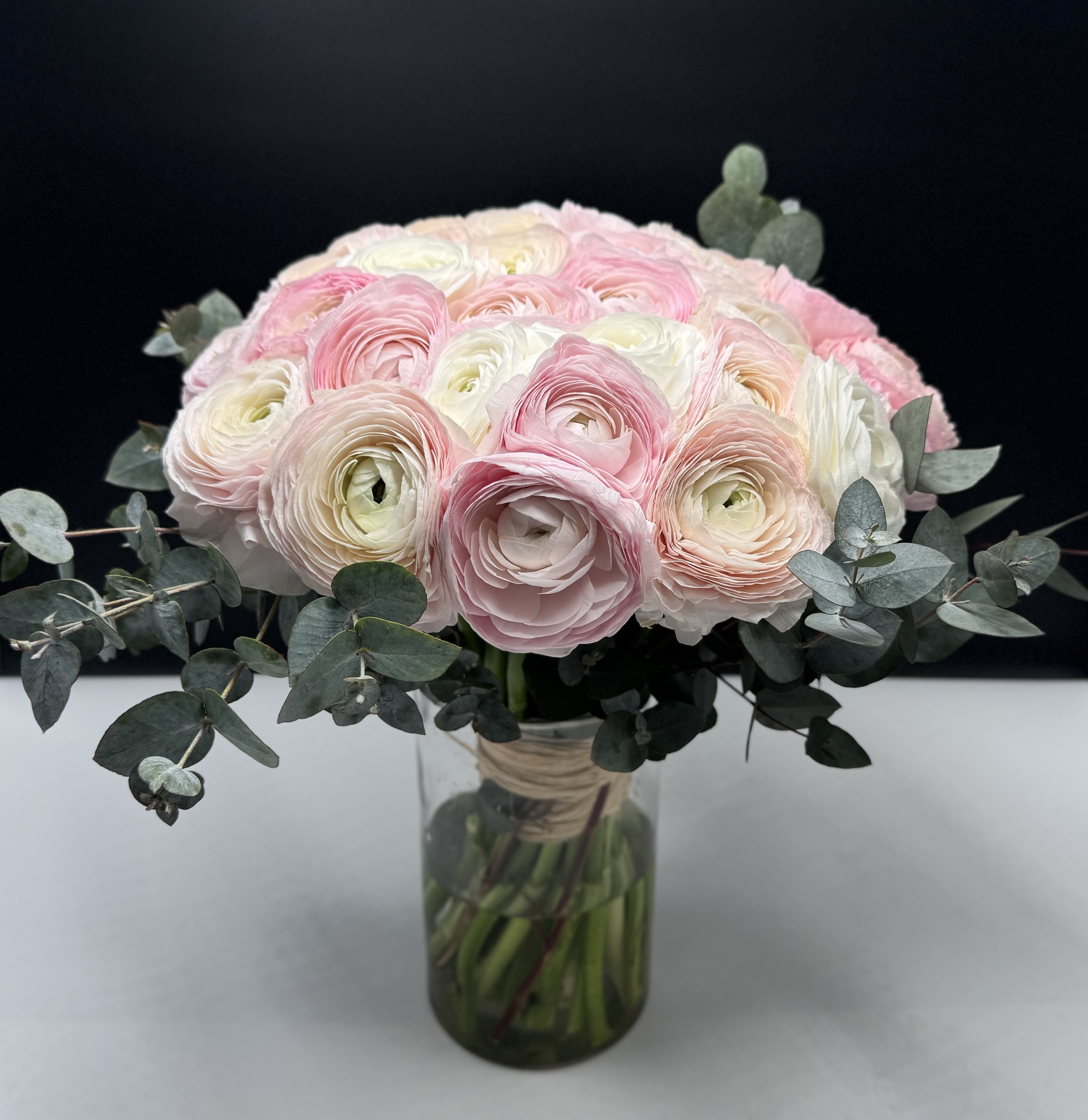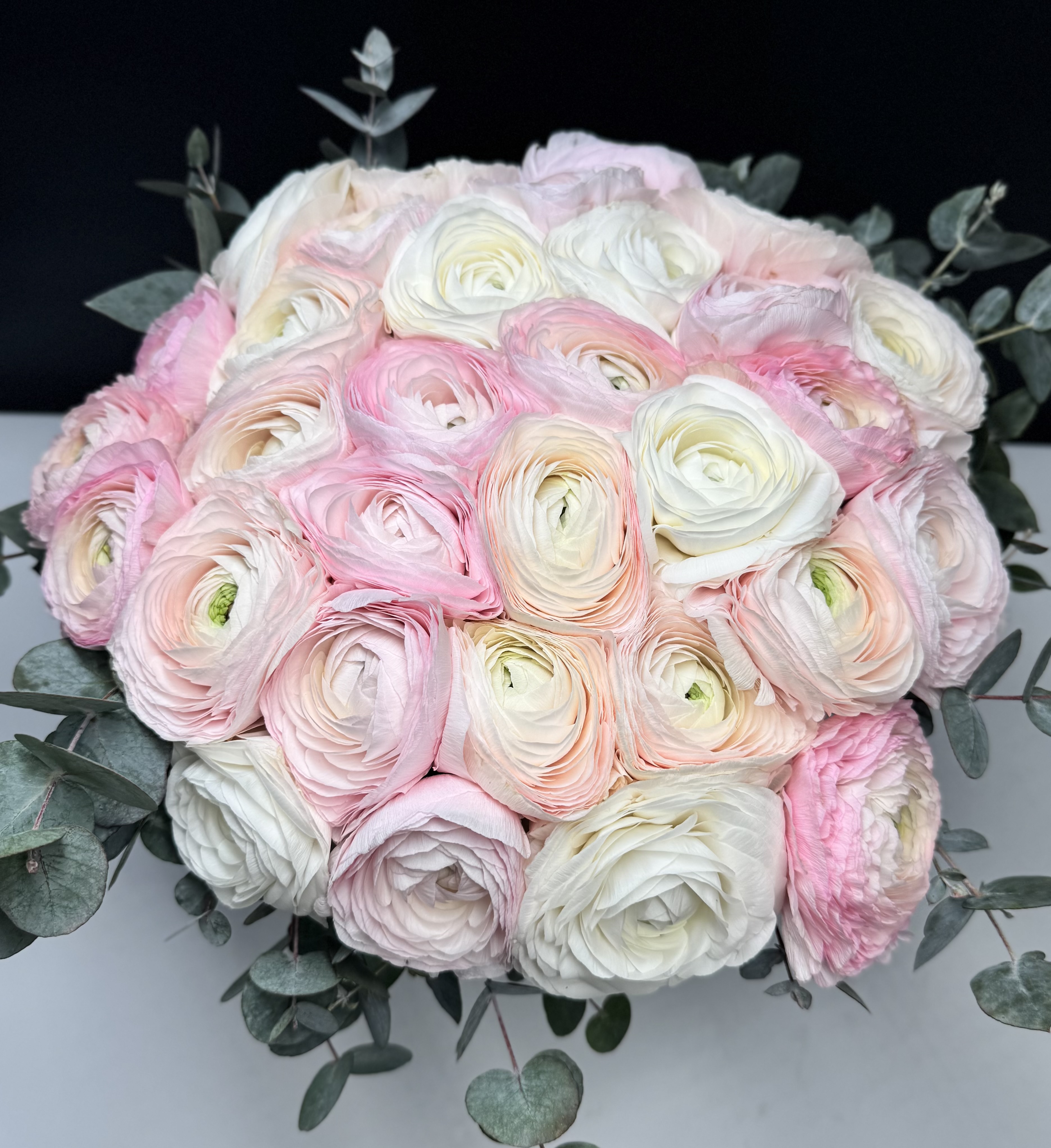 Микс из ранункулюсов, сезонная зелень, фирменная упаковка, фирменная карточка для текста (по желанию).