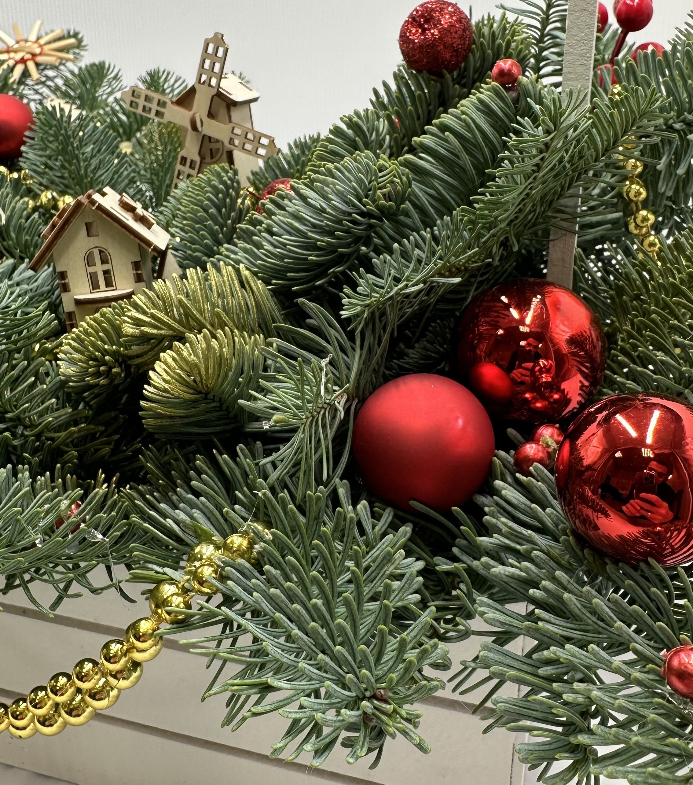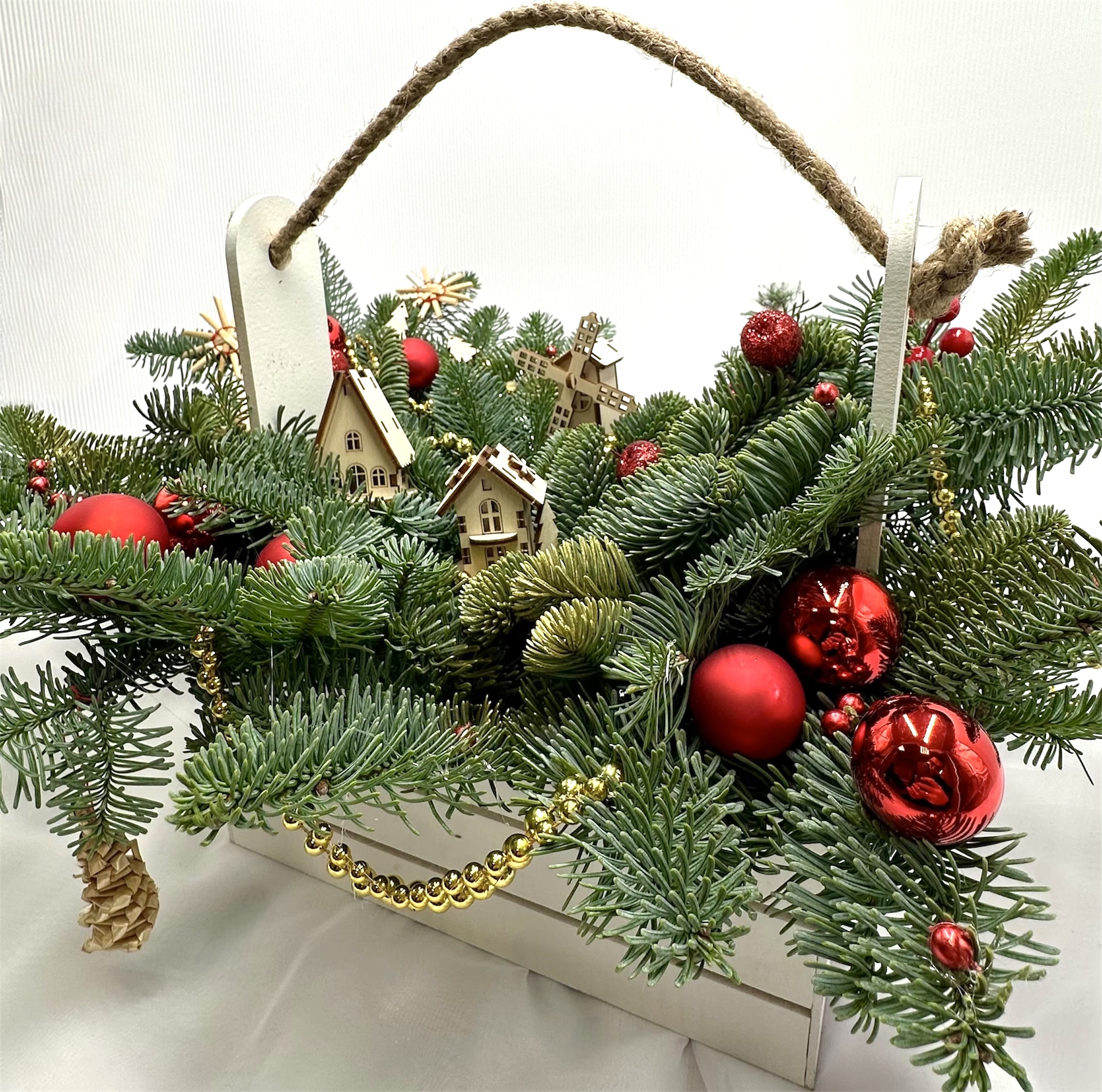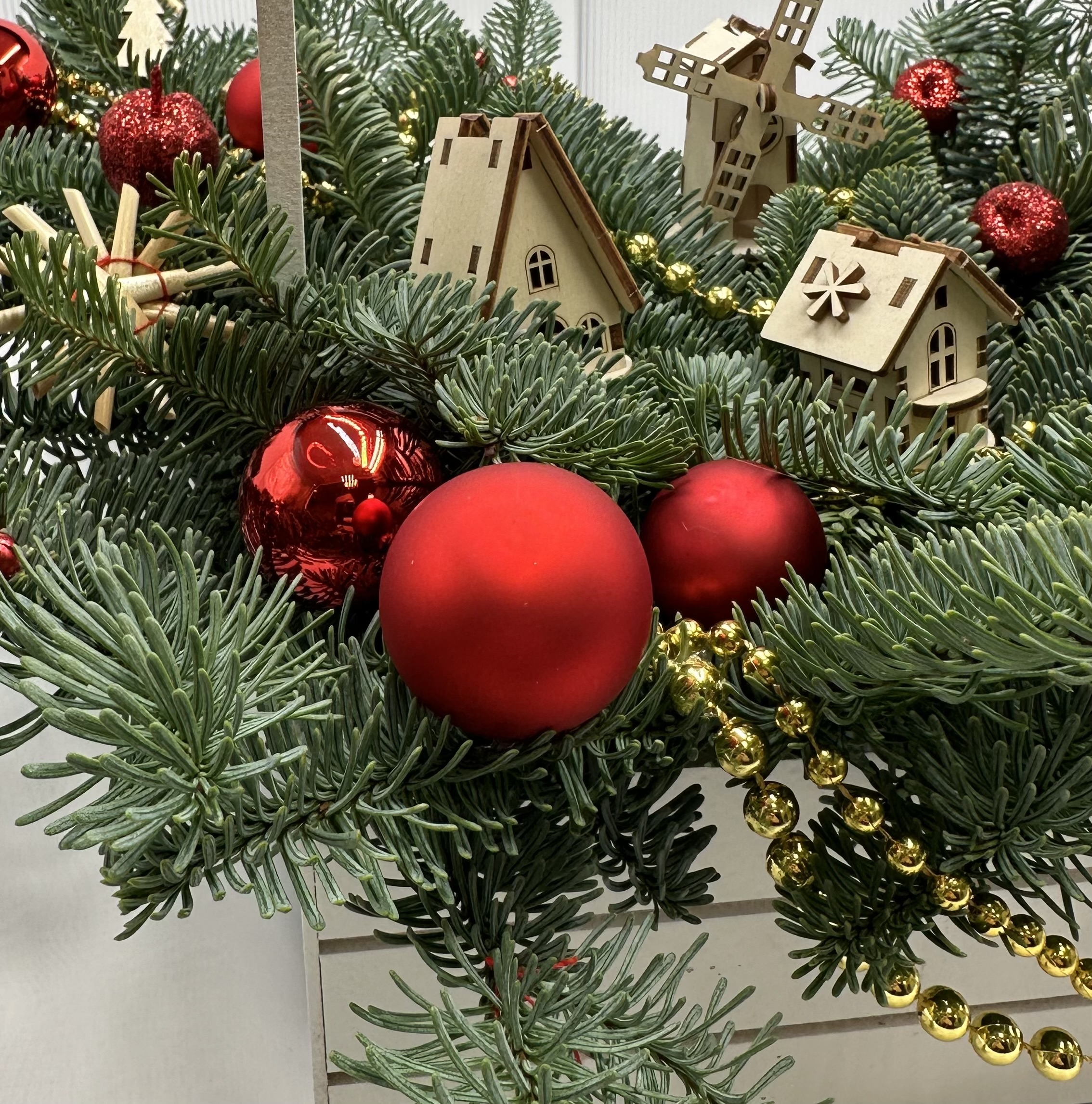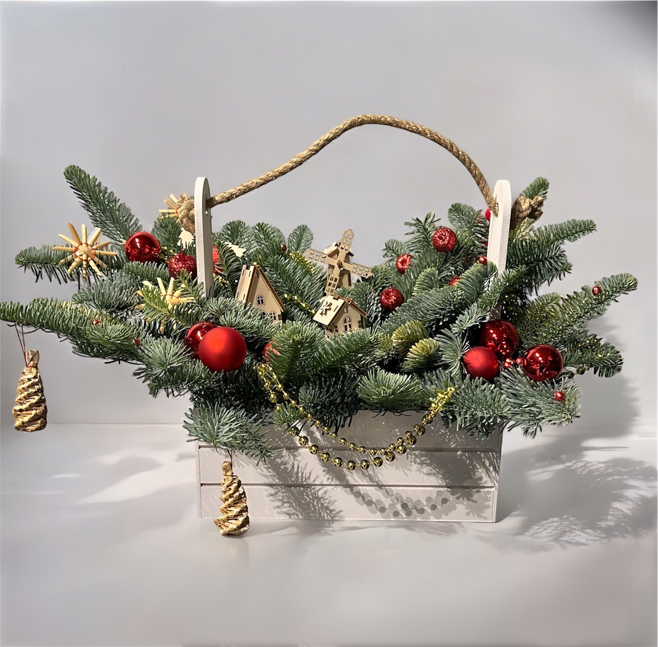 Веточки нобилиса, деревянный ящик, новогодний декор, транспортировочная упаковка, новогодняя открытка (по желанию)