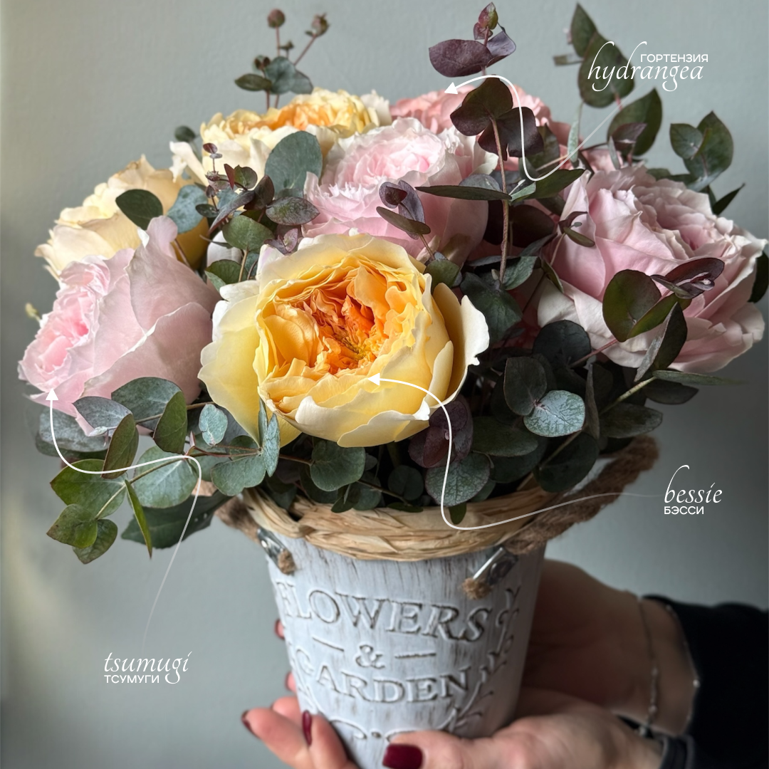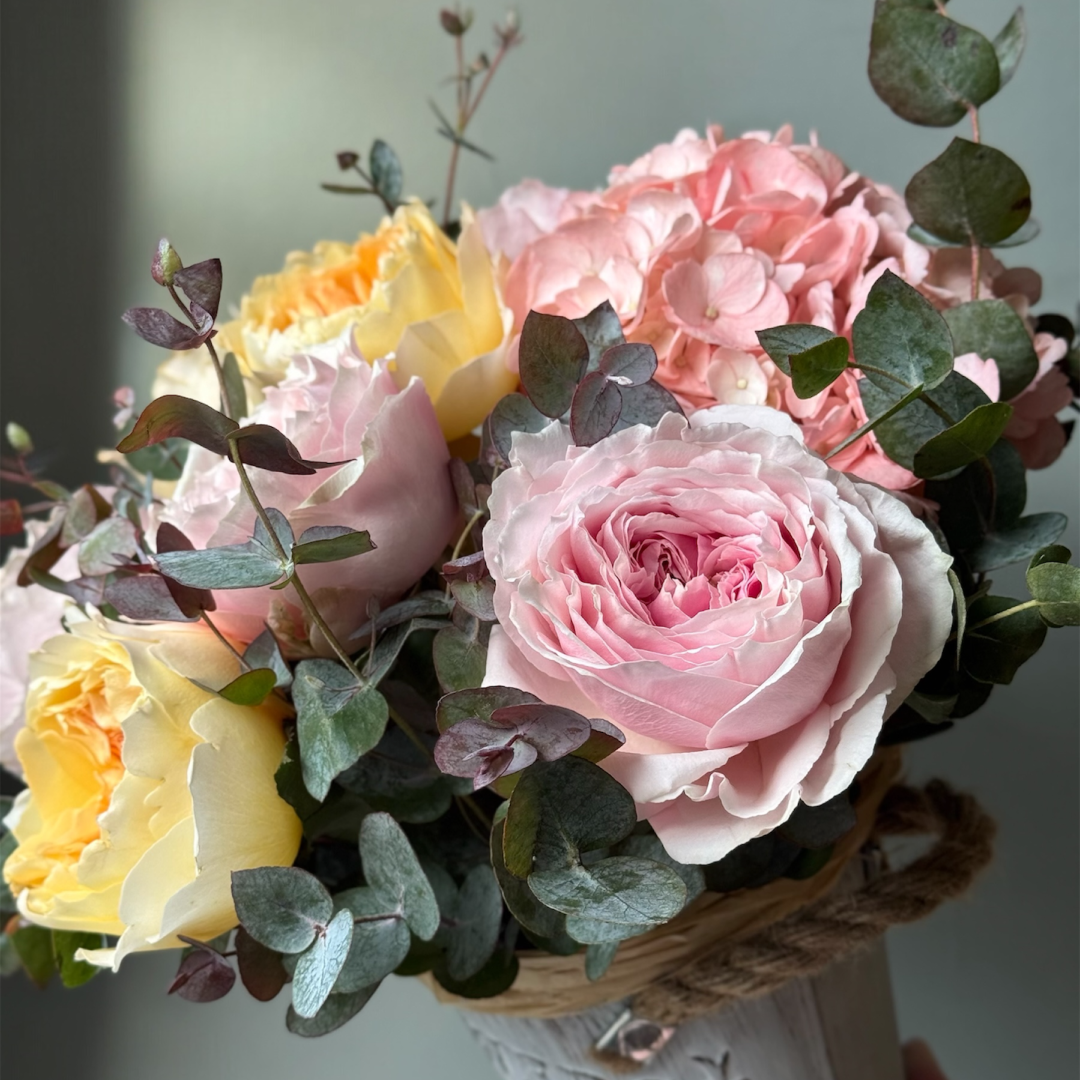 Нежная цветочная композиция, гармонично сочетающая яркие и пастельные оттенки