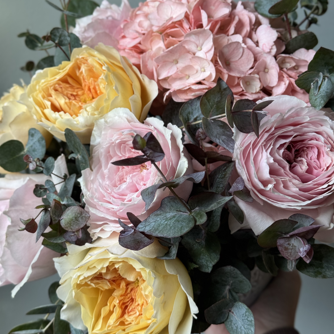 Микс из роз с добавлением гортензии, сезонная зелень, фирменная упаковка, фирменная карточка для текста (по желанию).