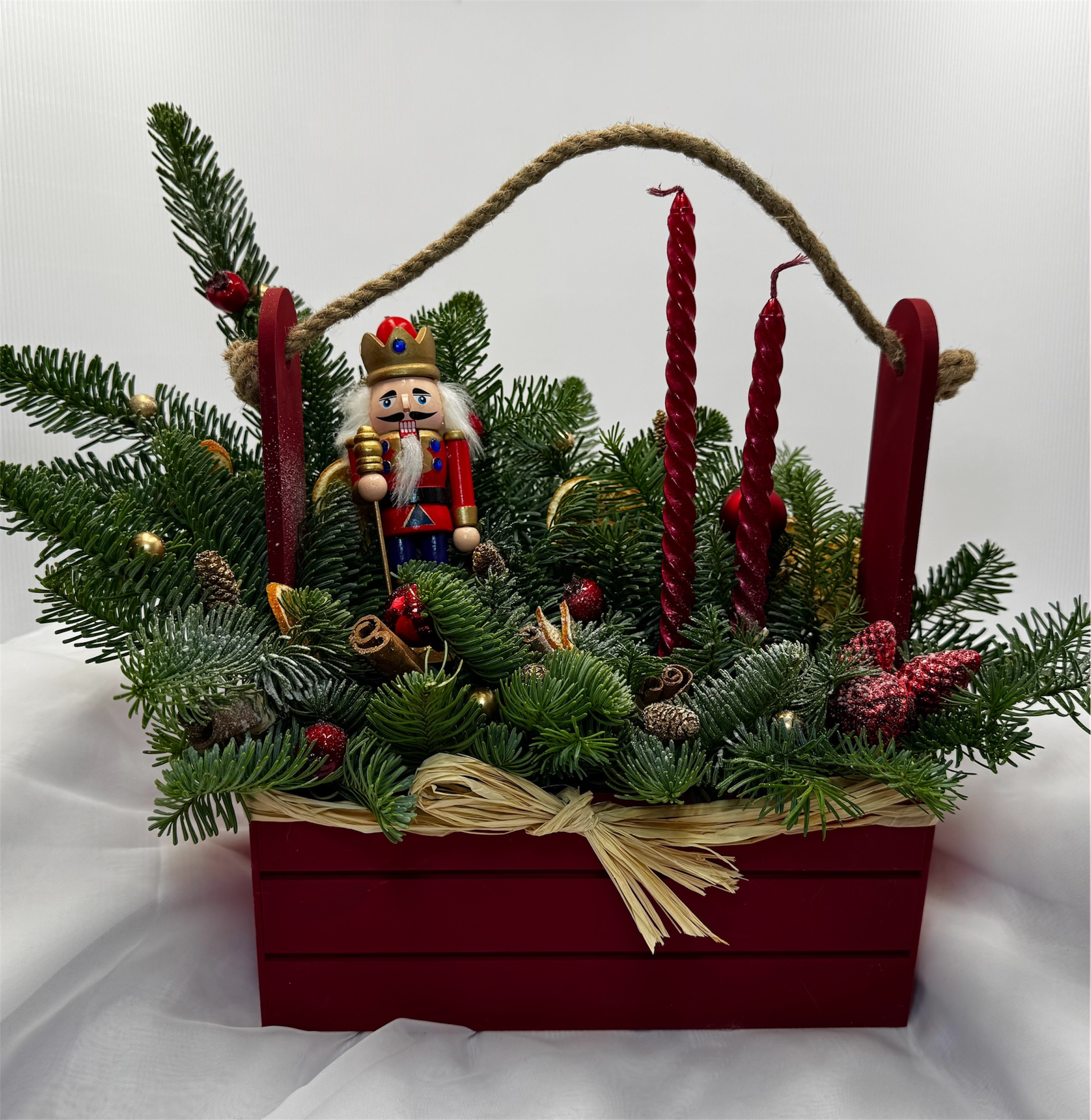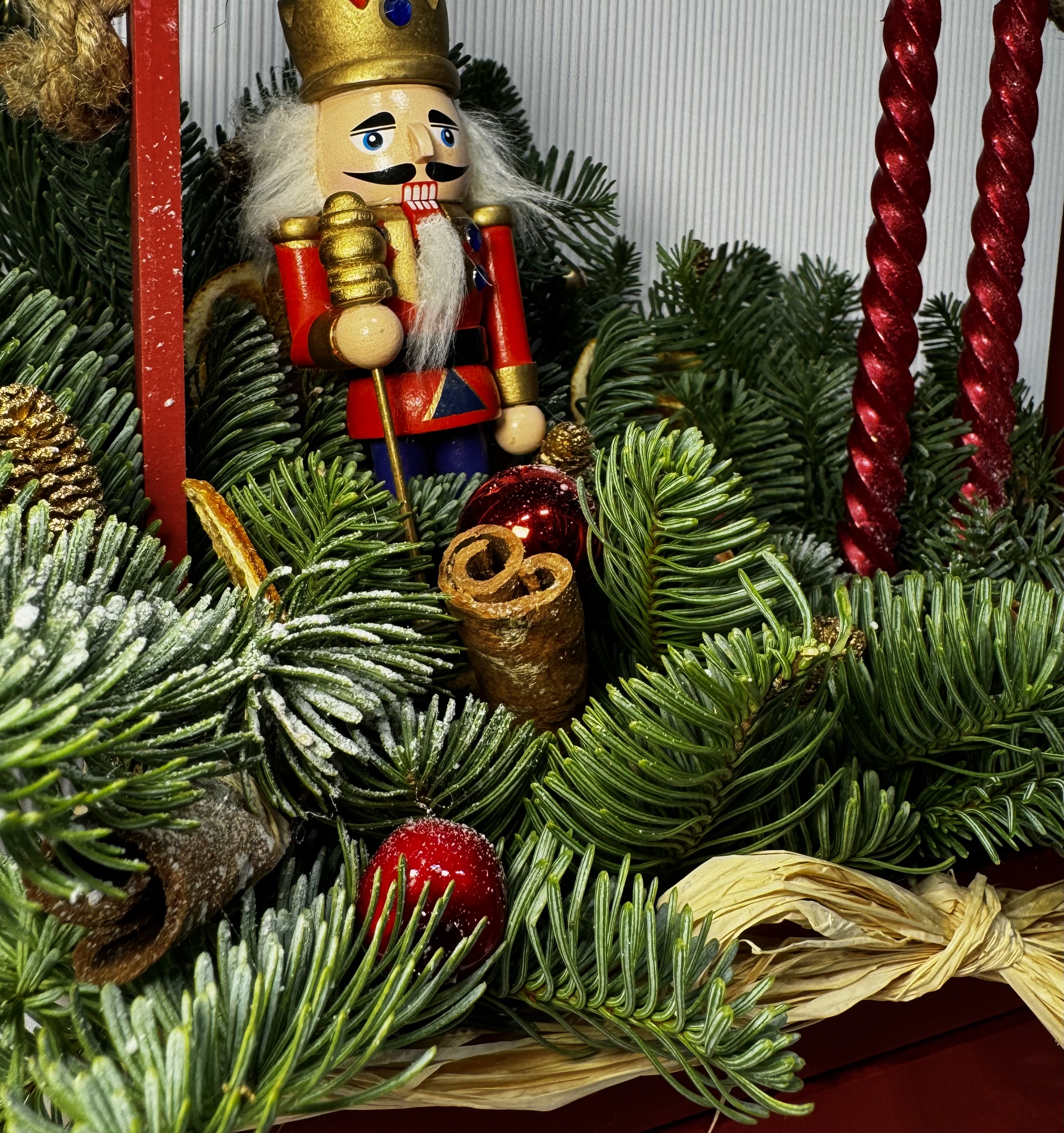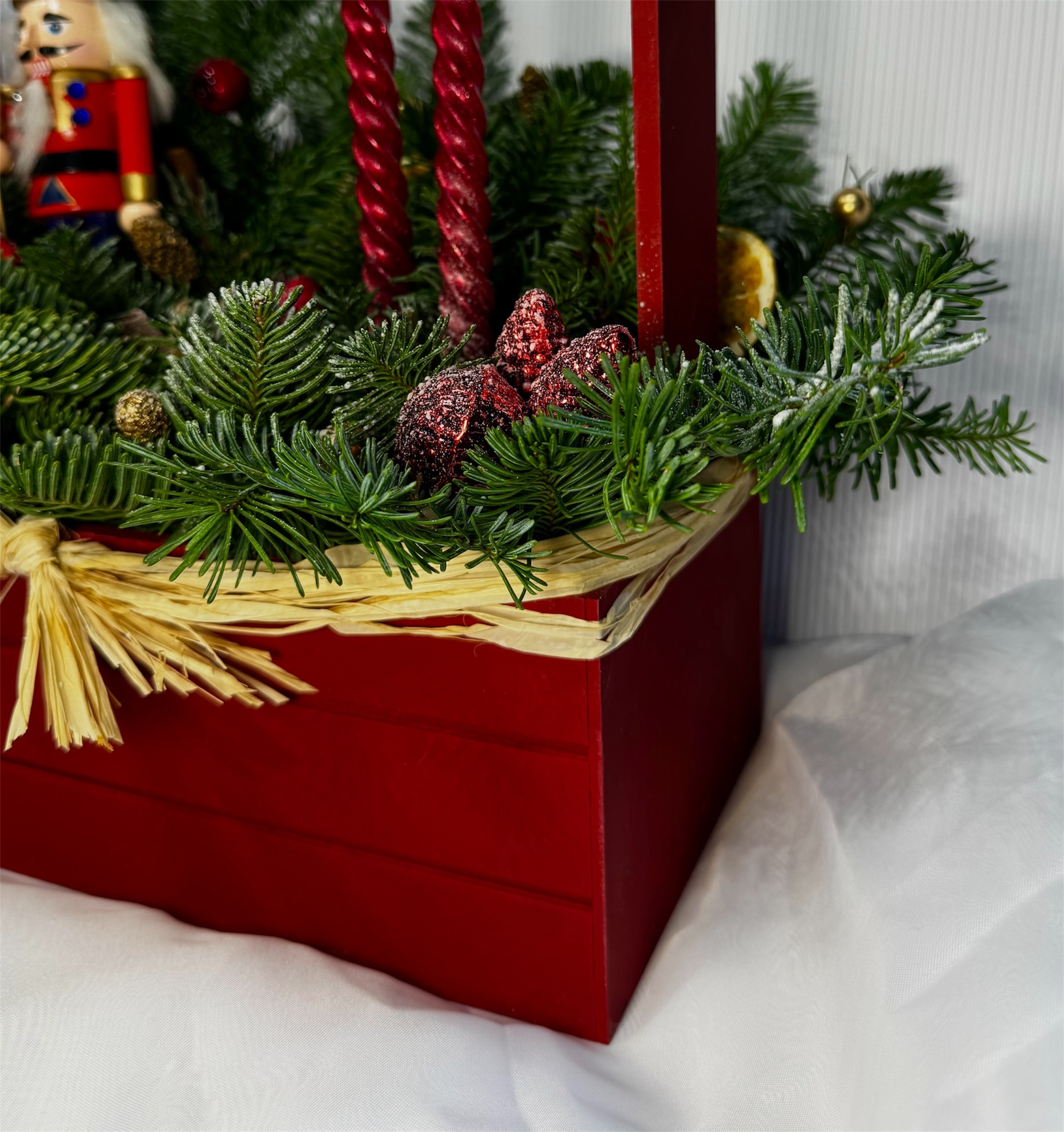 Веточки нобилиса, деревянный ящик, фигурка щелкунчика, свечи, транспортировочная упаковка, открытка (по желанию)