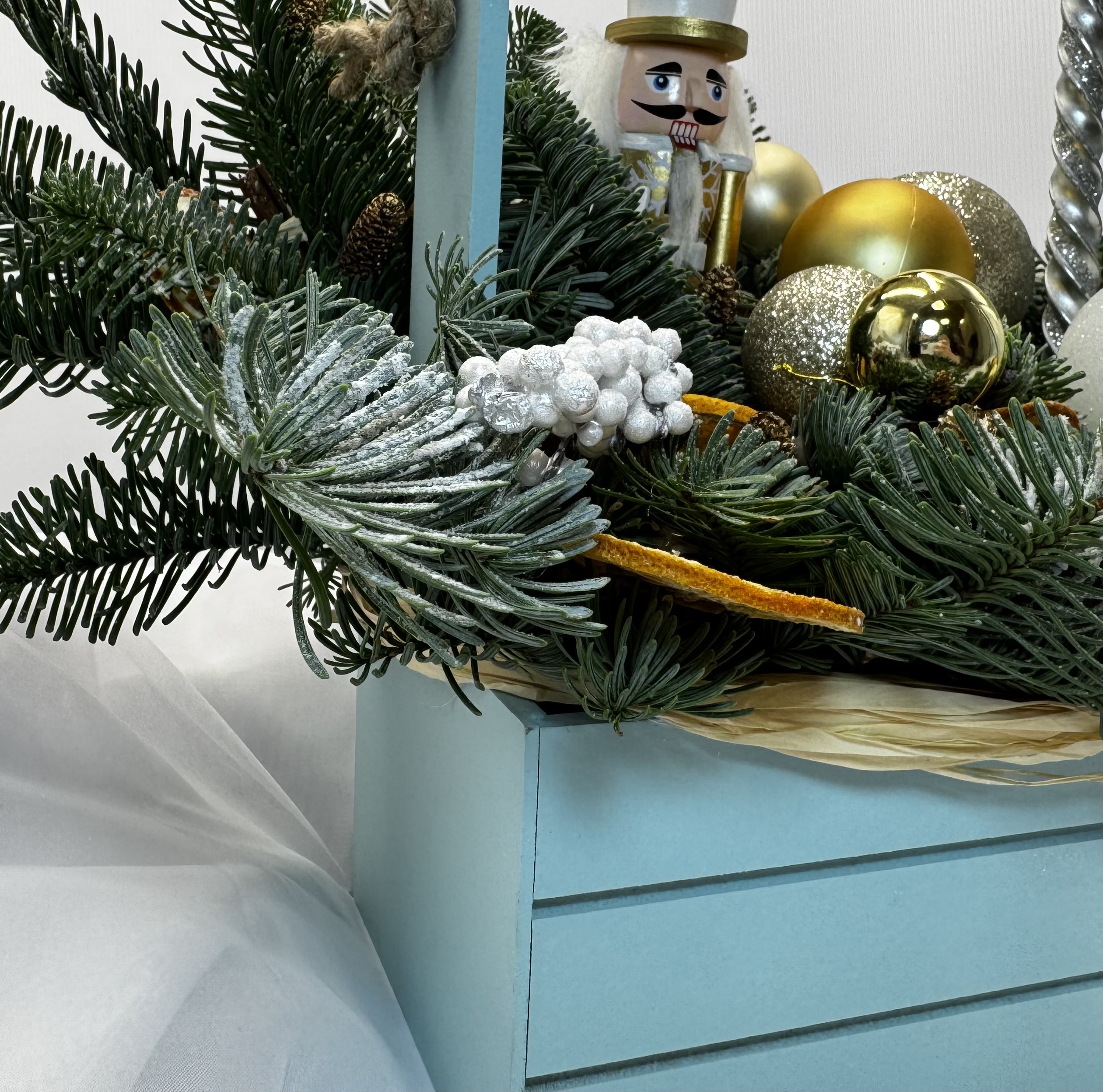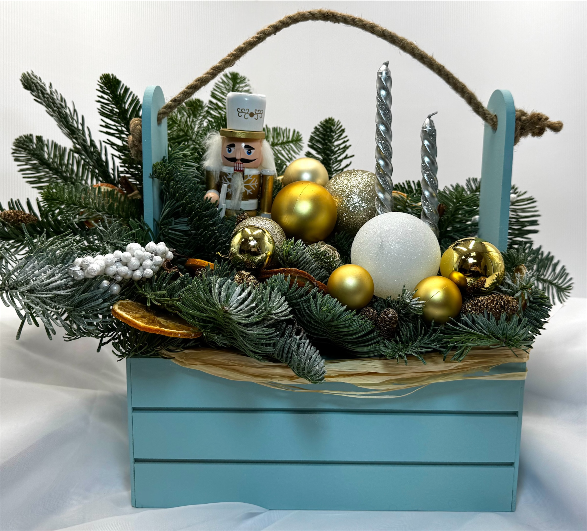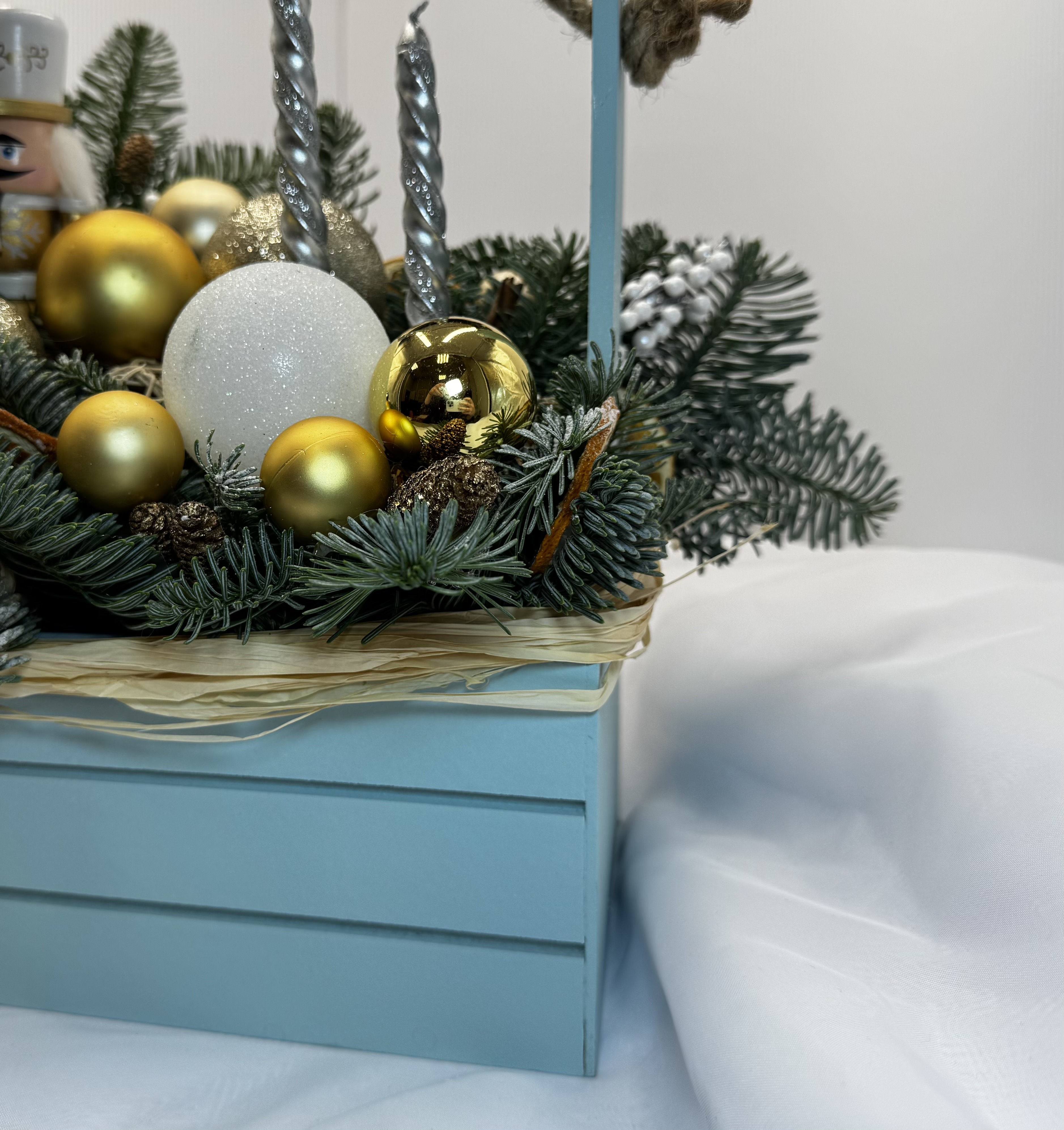 Веточки нобилиса, деревянный ящик, фигурка щелкунчика, транспортировочная упаковка, открытка (по желанию)