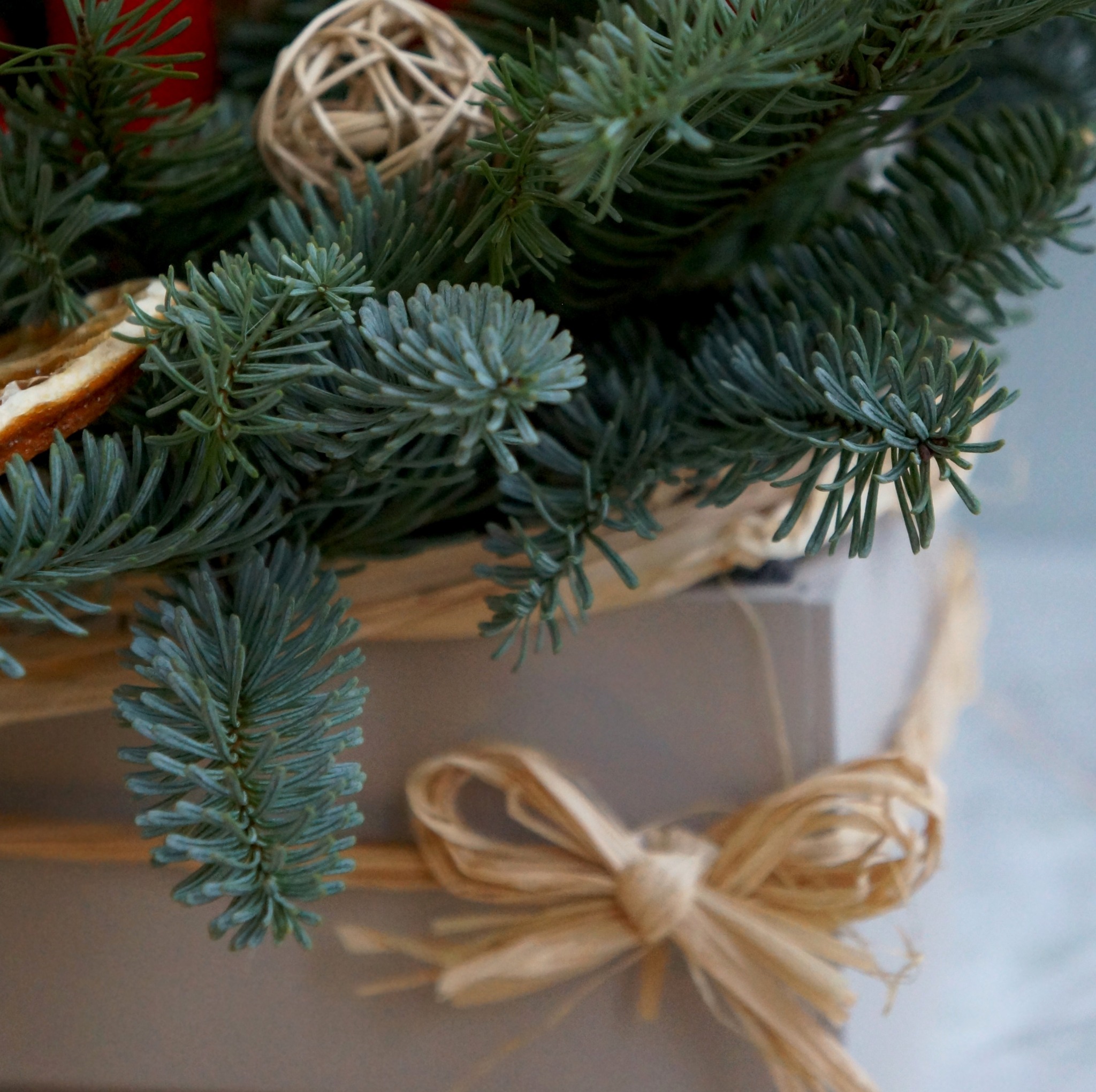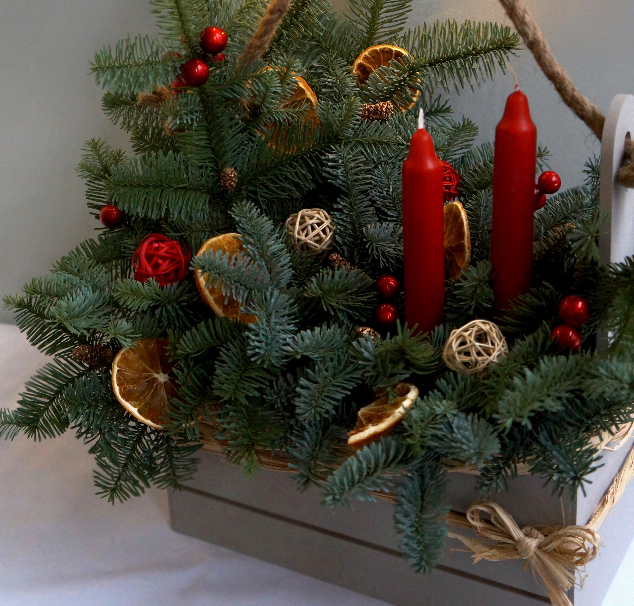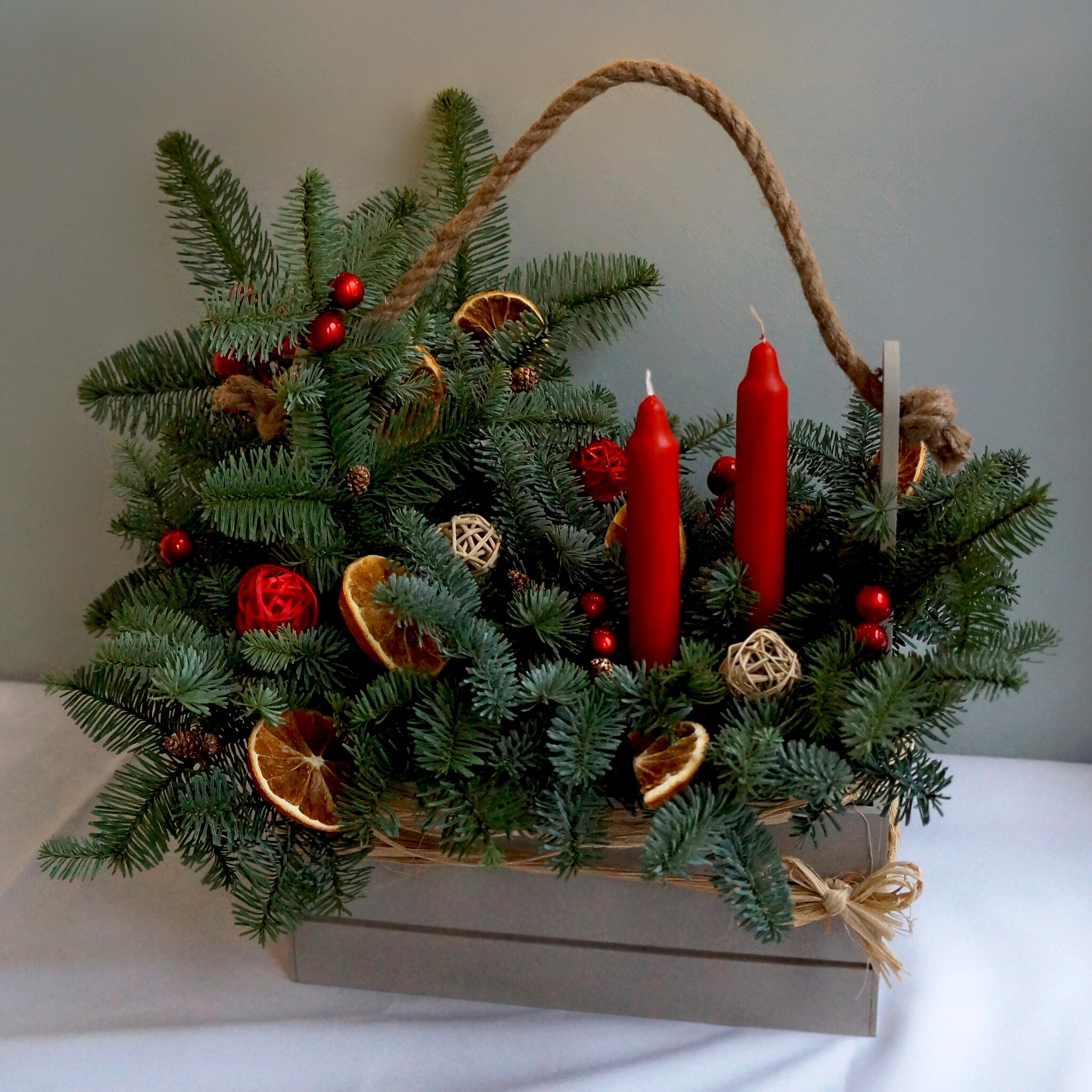 Композиция, собранная из веточек нобилиса, новогодний декор (искусственный или натуральный), деревянный ящик, транспортировочная упаковка, открытка (по желанию).